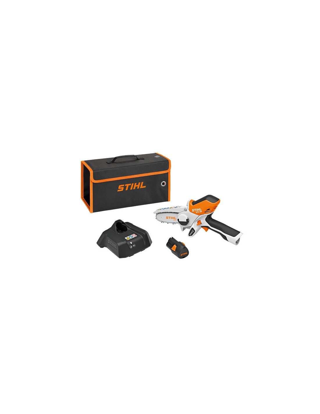 Agil mini podador de corrente a bateria. Para podar arvores e arbustos, cortar residuos verdes e para trabalhos em madeira. Com corrente PM3 1/4. para um alto rendimento de corte e preciso. Pega antiderrapante para uma ergonomia perfeita, substituicao da corrente sem necessidade de ferramentas, cobertura de protecao flexivel para um trabalho seguro, com indicador do estado da carga. Kit completo inclui: 1 x Bateria de iao de litio AS 2, 28 Wh, 10,8 V 1 x Carregador standard AL 1 1 x Guia Light 10 cm 1 x Corrente 10 cm PM3 1/4' 1 x Multioil Bio, 50 ml 1 x Bolsa de transporte preto / laranja com ilhos de montagem