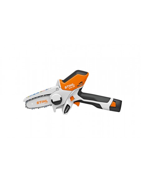 Agil mini podador de corrente a bateria. Para podar arvores e arbustos, cortar residuos verdes e para trabalhos em madeira. Com corrente PM3 1/4. para um alto rendimento de corte e preciso. Pega antiderrapante para uma ergonomia perfeita, substituicao da corrente sem necessidade de ferramentas, cobertura de protecao flexivel para um trabalho seguro, com indicador do estado da carga. Kit completo inclui: 1 x Bateria de iao de litio AS 2, 28 Wh, 10,8 V 1 x Carregador standard AL 1 1 x Guia Light 10 cm 1 x Corrente 10 cm PM3 1/4' 1 x Multioil Bio, 50 ml 1 x Bolsa de transporte preto / laranja com ilhos de montagem