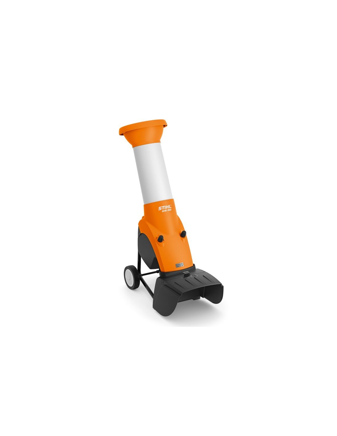O funil insonorizado inclinado lasca ramos com um diametro de ate 35 mm. A introducao dos ramo no funil e facilitado pelo efeito de alimentacao automatica do disco de lamina.