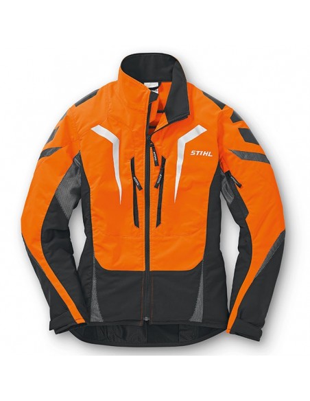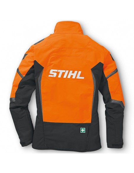 Leve e com respiracao muito ativa. Especialmente adequado para temperaturas quentes ou atividades fisicas intensas. Cor de laranja de advertencia e preto. Com forro de rede nas costas, bracos e bolsos que oferece uma ventilacao otima. Repele a agua e a sujidade. Varios bolsos. Com logotipo grande da STIHL na parte de tras.